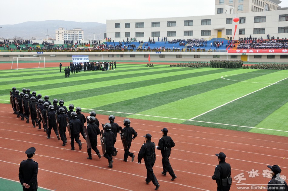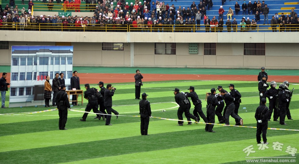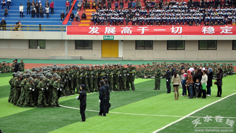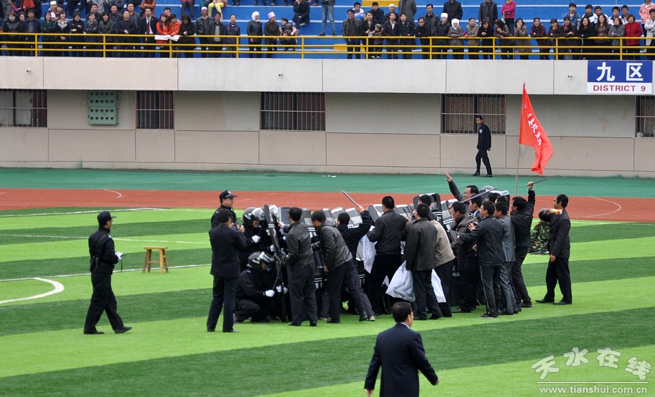 突发性群体事件处置演练(图为应急处突警戒组到达现场)