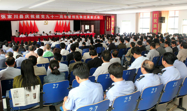 为庆祝中国共产党成立九十一周年,表彰奖励在全县经济社会发展和党的建设中涌现出来的创先争优先进基层党支部、优秀共产党员和优秀党务工作者,进一步贯彻落实党的十七大及十七届三中、四中、五中全会精神,切实提高各级党组织的执政能力,凝聚和激励各方面的力量,积极投身全县经济社会发展,加快构建社会主义和谐社会。6月27日,张家川回族自治县在行政中心礼堂隆重召开庆祝中国共产党成立九十一周年暨创先争优表彰大会。