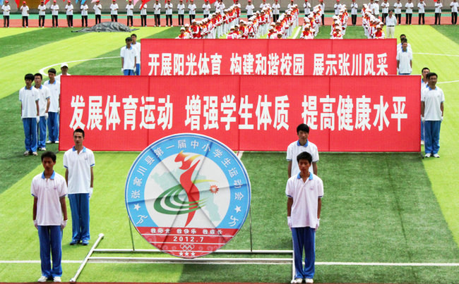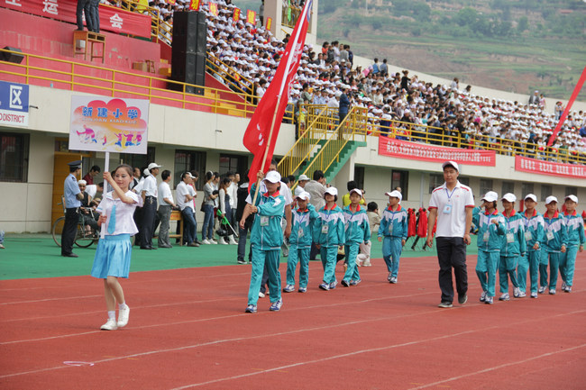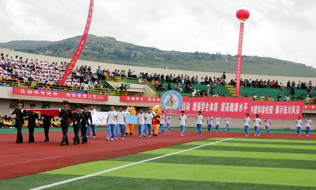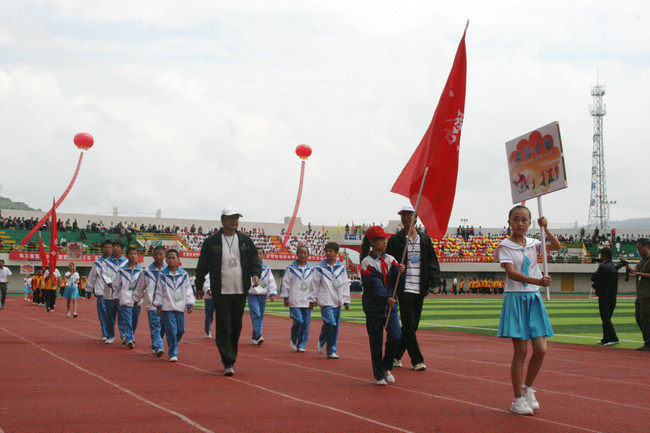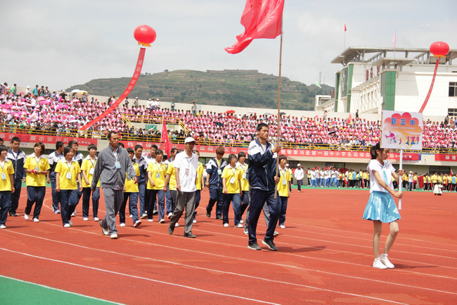 首先入场的是国旗队,五星红旗在绿茵场上格外耀眼,鲜亮夺目,在12名武警战士的护卫下,庄严的进入会场;紧随其后的是张家川县第一届中小学生运动会会徽和标语队,在12名学生的簇拥中进入会场,会徽上熊熊燃烧的火炬,象征着张家川蒸蒸日上的体育事业,充分展示了张家川师生奋发向上、勇于拼搏的精神风貌;鲜艳的花束在空中舞动,灿烂的笑脸鲜花般开放,“科学健身、团结鼓劲、振奋精神、健康向上”的口号响彻云霄;在本届运动会中,裁判员方阵来自全县教育系统,他们是一支高素质、高水平的队伍,他们将担负着全部比赛项目的裁判工作,以认真的态度,公平、公正、严肃的工作作风为全县运动会的胜利举行公正裁决,确保比赛顺利进行;所有代表队都祝运动会成功,祝张家川明天更美好。