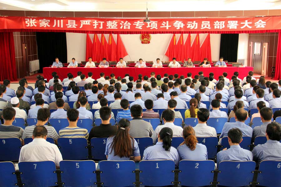 7月5日,张家川回族自治县在行政中心大礼堂召开严打整治专项斗争动员部署大会。县委副书记、县长马中奇出席并作重要讲话,县委常委、纪委书记赵东红,县委常委、常务副县长夏草,县委常委、政法委书记何永东,县委常委、宣传部长王志军,县人大副主任马毅峰,副县长李希富,县政协副主席马玉萍,各乡镇、各单位负责人及全县公、检、法全体公安干警,执法队员共200余人参加动员大会。