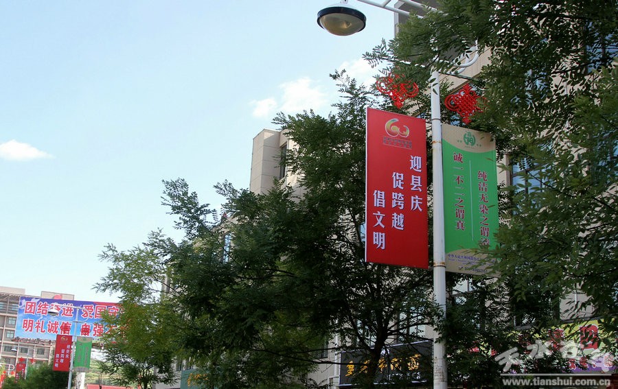 美化工程增底蕴。 近日,县行政广场周边“迎县庆、促跨越、倡文明”、“团结奋进、开放开发、跨越发展”等一幅幅言简意赅、主题鲜明的县庆宣传道旗和“团结奋进、爱国守法、明礼诚信、自强不息”的大型户外宣传牌格外惹眼。这是张家川县为营造自治县60华诞热烈、喜庆的活动氛围,以“对外扩大影响、对内凝聚人心”为宗旨,加大社会宣传的具体写照。据了解,张家川县在张清路、张寺路、庄天二级公路沿线共更换制作大型宣传6块、小型宣传牌10块、宣传横幅50条,在阿阳大道、行政广场周边等路段悬挂道旗400余幅。同时。县城人民路、中城路、等城区主干道两侧行的商家自行挂起红火灯笼、彩旗、三角旗、搭建彩门,营造浓厚的县庆氛围。