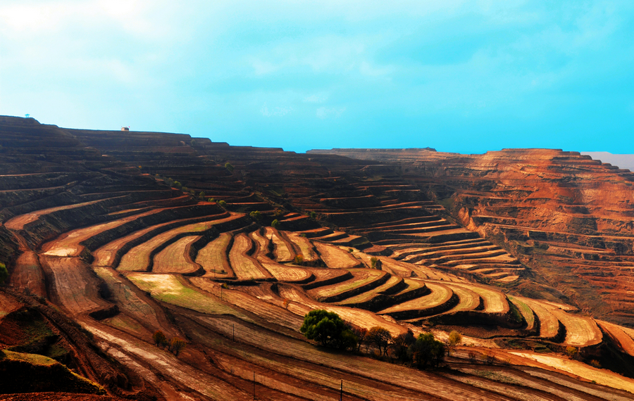 “这里原来是一片陡峭的山坡地,耕种时都还是原来的二人抬杠式。现在好了,农田路宽了、地平了,种地都用上机械了。”张家川县大阳乡村民马尔吉指着一层层的梯田对记者说。