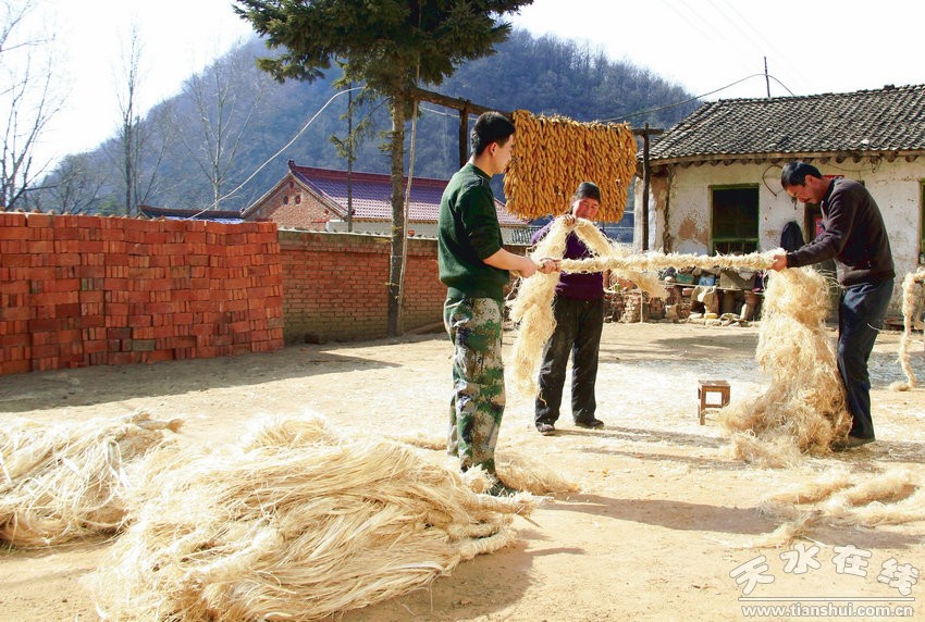 忙碌的学者们,因为专心寻觅丝绸之路上历史的车辙而无暇顾及大山脚下村姑们手中汉麻。马鹿乡的村民对此毫不在乎,因为他们坚信汉麻是丝绸之路留给他们的“金丝银条”,所以无论春夏,他们都会安静的在自家门口享受着种植和加工汉麻带来的快乐。在汉麻收获的季节,村姑们或独自一人,或三五成群,或站,或坐,就为把那一条五尺长的麻皮完完整整的从麻杆上剥离。时间悄悄在指缝中流失,总会有那么一两个人耐不住寂寞,讲三四个笑话,打破劳作的安静气氛,给同伴们带来一些意外的欢乐,直到那长有四尺,宽若半指的“银条”在空中换过一道优雅的圆弧,随着欢声笑语缓缓落到手中。