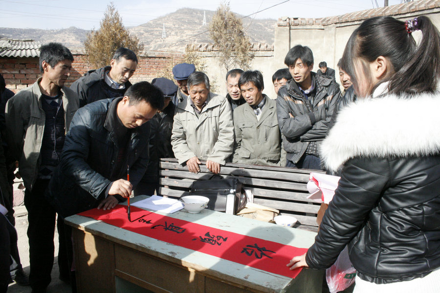 “过大年,贴春联”是中华民族的传统,是象征吉祥、表达人们向往美好生活的民族风俗。在张家川县2014年迎新春“送戏下乡”活动现场,最耀眼的要数“写春联、送春联”了,县书画家身边围满了农民群众,他们有的帮着按纸,有的在排队等待着,眼中充满了期待和喜悦。“中国心,中国印,中国结,中国梦,心心相印结成梦、百年辙,百年辛,百年赢,百年情,辙辙艰辛赢在情”、“美丽中国梦,文明幸福家”、“联村联户连民心、为民富民真惠民 ”,一幅幅吉祥喜庆、墨宝飘香的春联既写出了农民群众对新年的喜悦,也描绘大家对更加美好生活的憧憬和期待。来自我县的书法家,现场挥毫泼墨,为百姓书写了近300幅春联。红红的纸、红红的对联,映红了村民的心,也映红了红红的日子。
