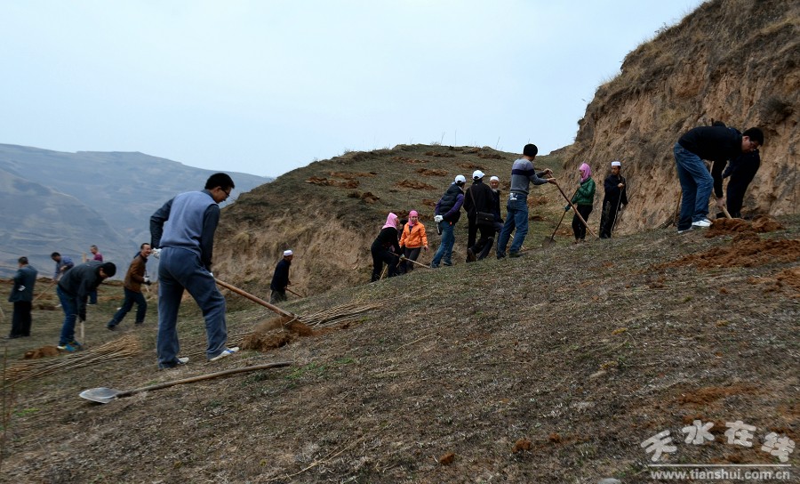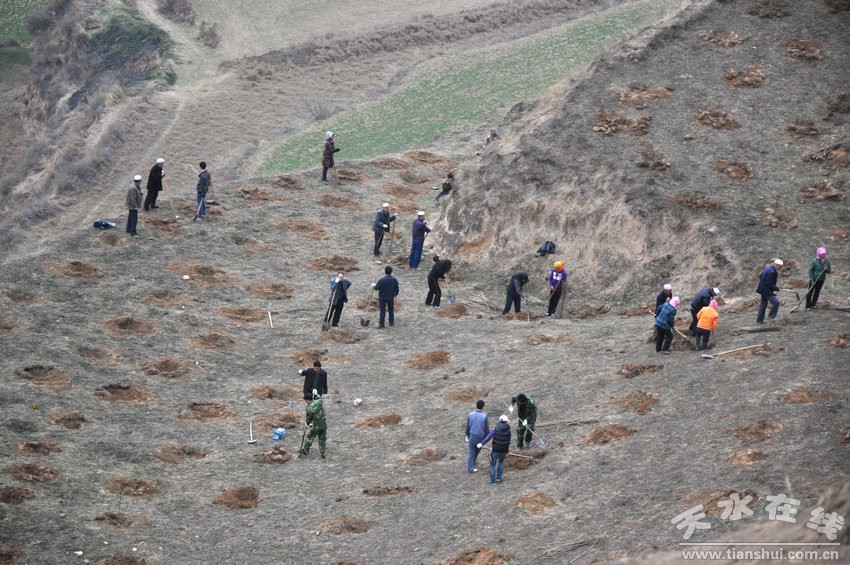 4月1日,在胡川乡王安村高庄屲的荒山坡上,有的干部高挥䦆头、深挖树坑,有的群众扶苗培土、拎水灌溉,分工合作,配合默契,每一个步骤都做得细致认真,林业技术人员不时奔走讲解、亲自示范,大家忙的不亦乐乎。一位名叫马五斤的村民栽植完一颗刺槐后,高兴的说:“今年的树苗根壮苗好,加上墒情好,这些树苗肯定都能活。”这是今年张家川县高标准推进沟壑梁峁林带化的一个缩影。