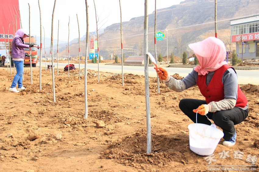 张家川县在高标准推进农村沟壑梁峁林带化建设中,选用2年生优质壮苗,每亩设计栽植167株,从各地调运苗木148万株。为了提高栽植质量,县林业局严格把好栽植技术关,采用2m×2m的株行距密度,挖坑深度50cm×50cm,调运乡土树种刺槐和柳树,栽植上坚持“三踏两踩一提苗”的方法,在浇水中添加生根液,确保种一颗活一棵,造一亩成一亩。