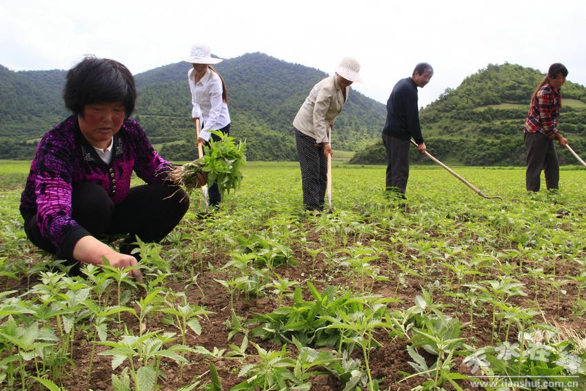 烈日当头,白杨村村民在大麻地里匀苗。一直以来,大麻是增加当地农民收入的主要经济作物。