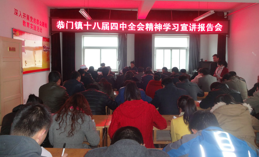11月19日上午,张家川县学习宣讲党的十八届四中全会精神报告会在恭门镇举行。县委宣讲组副组长、县委党校常务副校长张彦林出席报告会议,县委党校常务副校长张彦林作了主要讲话,恭门镇党政班子成员及全体干部、各行政村村支书、村委会主任、部分农民群众代表共120余人参加了宣讲会。
