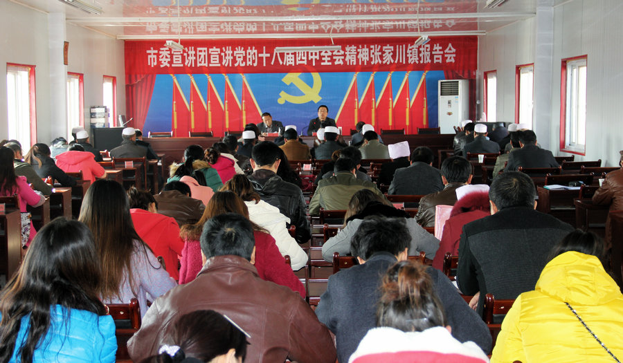 为深入学习贯彻党的十八届四中全会精神,11月25日,天水市委宣讲团深入张家川回族自治县张川镇宣讲党的十八届四中全会精神。张川镇负责人主持宣讲会,张川镇全体镇村干部100余人聆听了宣讲会。