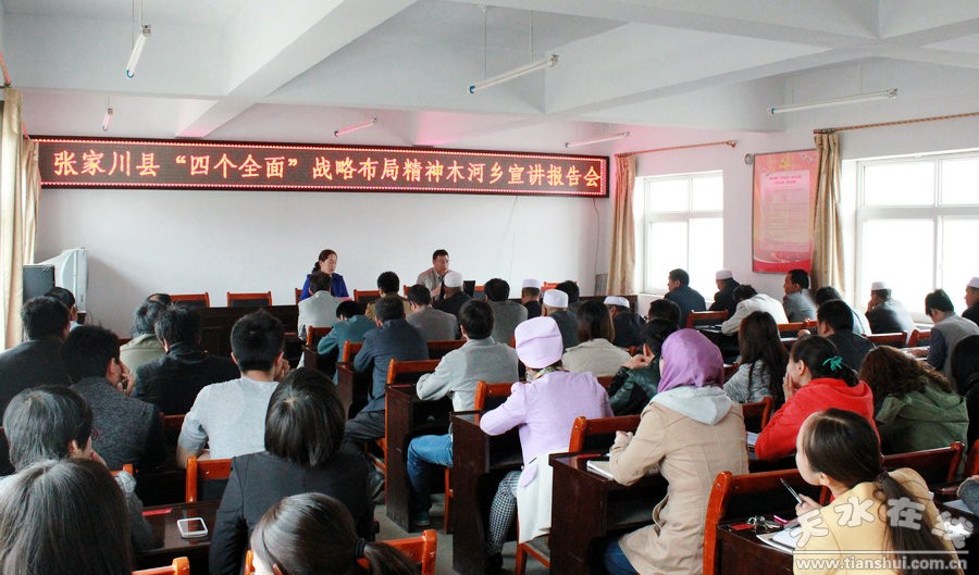 5月7日,张家川回族自治县委宣讲团走进木河乡宣讲习总书记提出的“四个全面”战略布局精神。县委讲师团成员、县委党校教师海世明作了题为“深刻理解四个全面战略布局”的宣讲报告。木河乡负责人主持报告会,木河乡全体乡村干部100余人聆听了报告会。