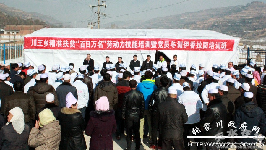 12月28日,由县委组织部、县人社局、川王乡政府举办的张家川县“伊香拉面师”培训班在川王乡正式开班,全乡400多名贫困户人员与马治忠一样在乡村两级干部的精心组织下,在川王乡铁洼村将开始为期30天的“伊香拉面师”培训工作。