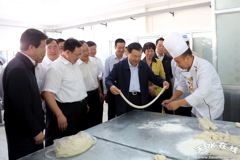 (图为省委书记、省人大常委会主任王三运调研张家川县扶贫工作时亲身体验“拉面”技术)