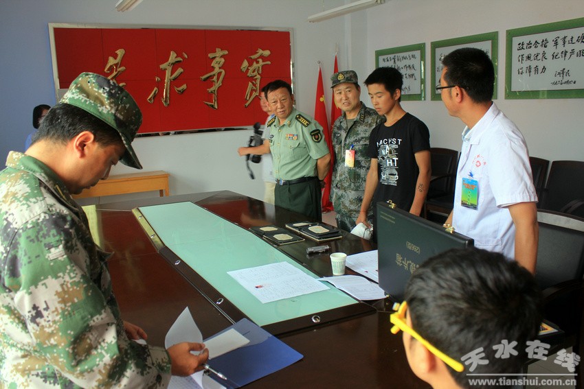 今年张家川回族自治县共有295名男青年网上报名应征,按照全县征兵任务数的3倍择优,县征兵办确定了170名初选预征对象。8月16日至18日,县征兵办组织预征对象进行体格检查,共有76人体检合格,其中大学生占比50%左右,合格者将进入下一阶段的政治审核。体检期间,天水市委常委、天水军分区司令员李建中对张家川县新兵入伍体检工作进行了检查指导,并看望了参加体检的应征青年和医务人员。