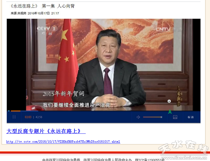 近日,由中纪委宣传部、中央电视台联合制作的大型专题片《永远在路上》在央视播出。为进一步增强警示教育作用,11月7日,张家川县委发出倡议,号召全县党政机关干部积极主动收看电视专题片《永远在路上》。即日起,县电视台和县政府网站将连续转播、转载央视网8集电视专题片《永远在路上》。