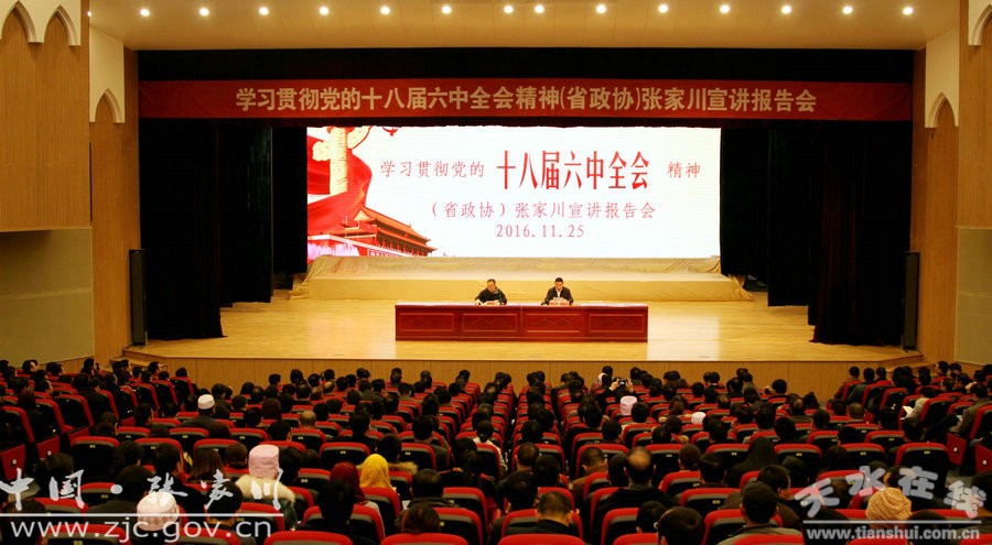 为了帮助基层广大党员干部群众全面、深入地学习党的十八届六中全会精神,更好地把思想和行动统一到六中全会精神上来,11月25日上午,省政协在张家川回族自治县开展党的十八届六中全会精神宣讲活动。省政协外事委主任黄周会作专题辅导报告。县委书记陈晰主持报告会。