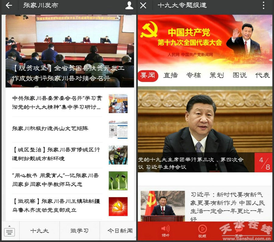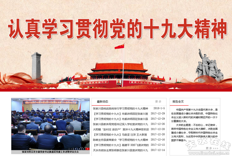 高举旗帜、引领导向,围绕中心、服务大局。党的十九大精神宣传,是2017年张家川县宣传思想工作的首要任务。围绕学习宣传贯彻党的十九大精神,印发了《关于深入学习宣传贯彻党的十九大精神的实施意见》和《张家川县开展党的十九大宣传报道工作方案》,在县电视台、县政府网站、“张家川发布”微信公众号开设“喜迎十九大”、“十九大时光”、“学习贯彻十九大精神”专题专栏,着力宣传解读党的十九大的重大意义、总体要求和工作部署。结合党的十九大精神,印发了《张家川县学习贯彻党的十九大精神宣讲工作方案》,制定了《张家川县学习贯彻党的十九大精神宣讲参考资料》,县四大组织领导深入各自所在支部、党建联系点、帮扶村等基层党支部扎实开展党的十九大精神“七进”(进机关、进社区、进企业、进农村、进校园、进网站、进宗教场所)系列宣讲活动30余场(次);邀请省、市委宣讲团和市委讲师团开展党的十九大精神、省第十三次党代会精神宣讲10余场(次),在全县上下营造了浓厚的十九大精神学习宣传氛围。