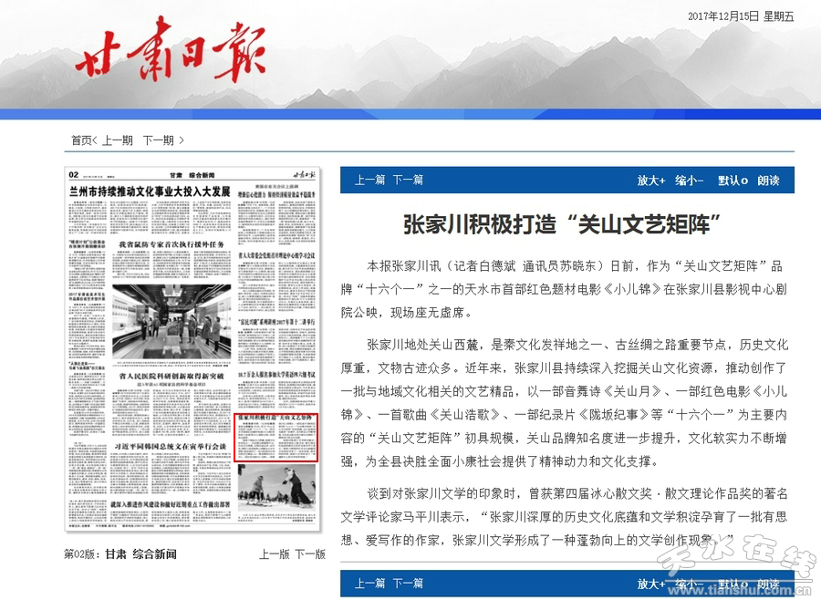 ▲2017年11月8日,天水市首部红色题材电影《小儿锦》首映,市委书记王锐,市政协主席张明泰,市委常委、秘书长、政法委书记蒋晓强,市人大常委会副主任蒲朝晖出席首映式 。