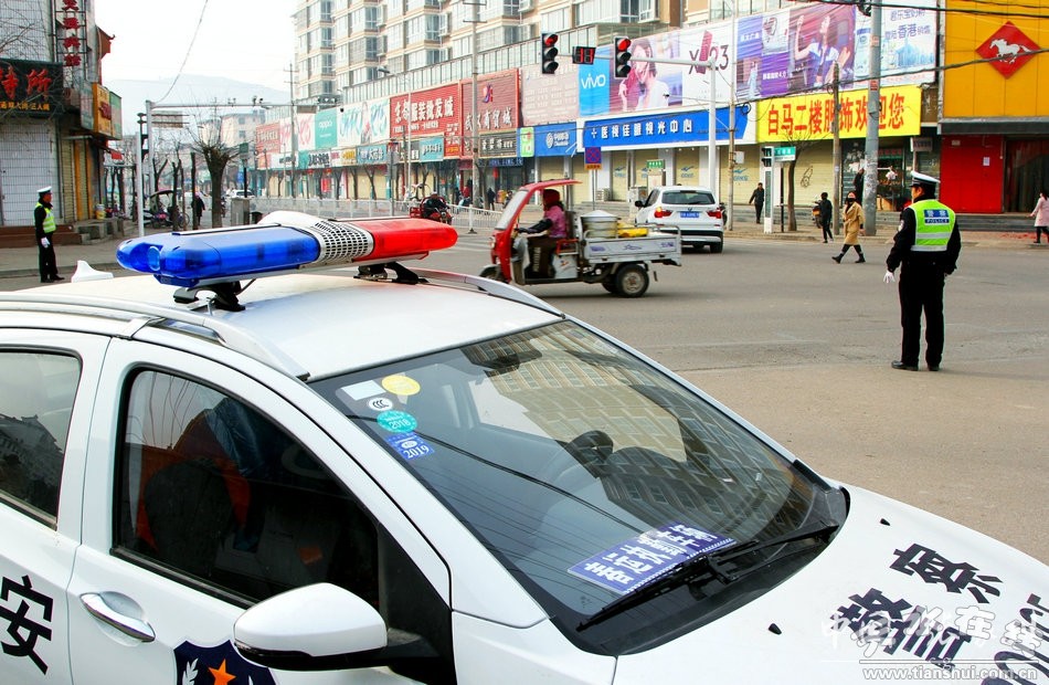 张家川镇瓦泉路口,从警5年有余的路查组交警王建军,正在和新同事马永智检查过往车辆,他们负责平安等三乡镇交通安全巡查工作。春节期间,县交警大队分8个组全勤上岗,全力保障节日期间城乡交通安全、畅通。