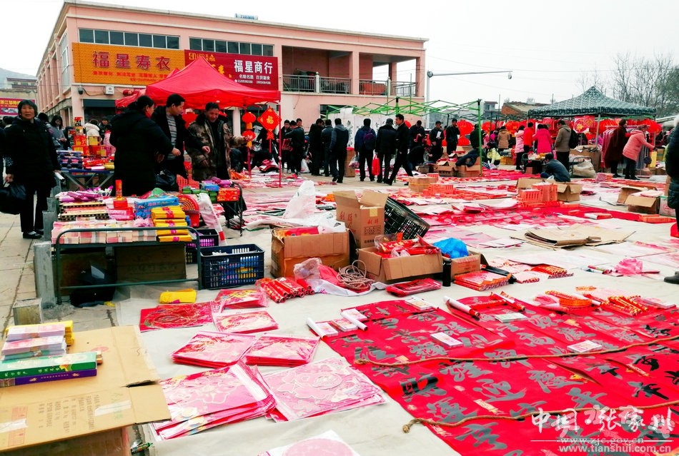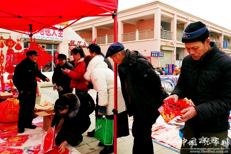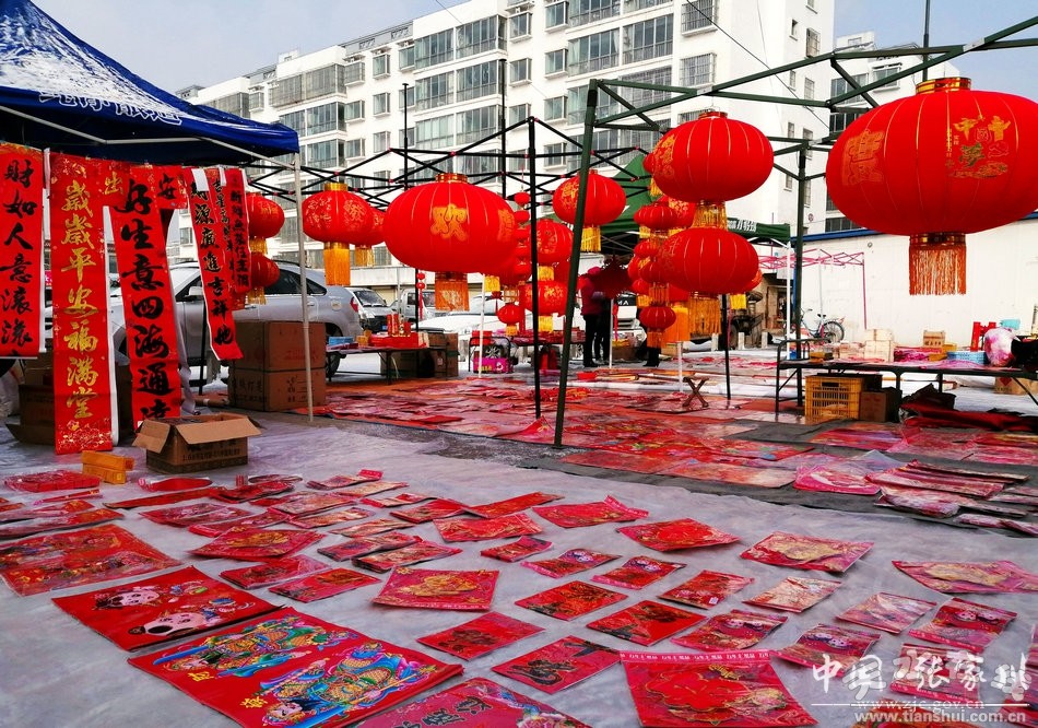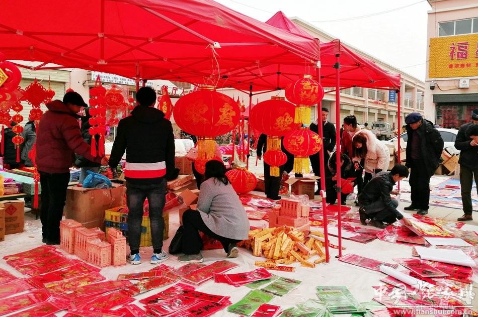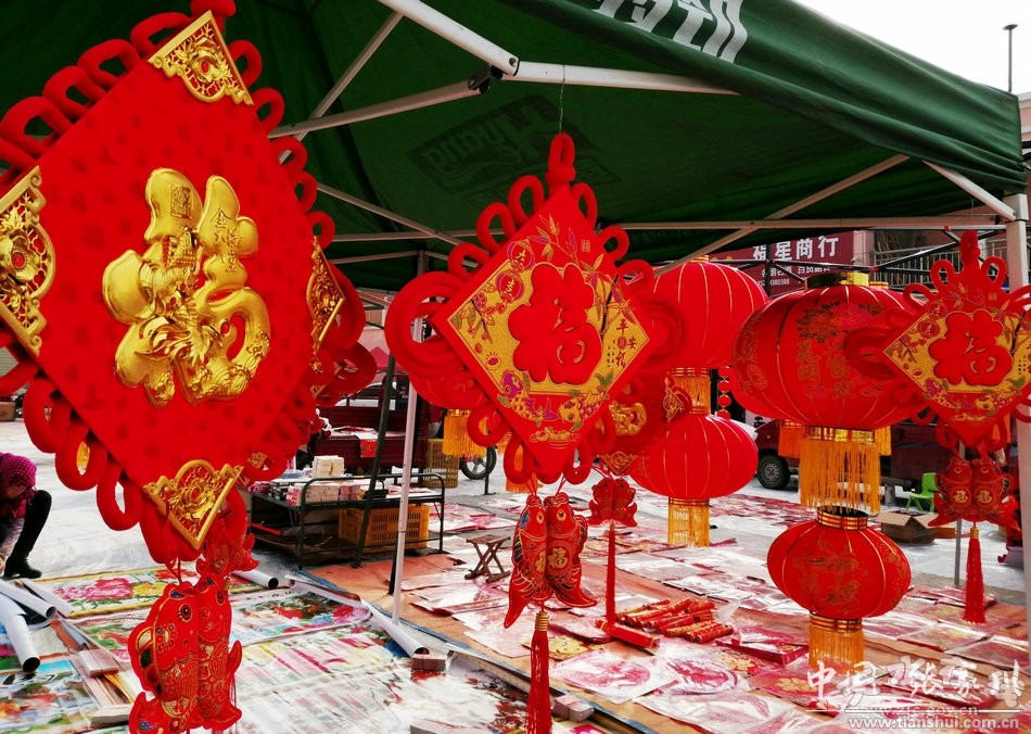 日前,在张家川县商贸城,城乡群众欢欢喜喜置办着必备的年货,市场上“年”的气氛,喜庆热烈。红灯笼、红挂饰、“中国结”和高高悬挂的“福”字……红红火火的文化年货,将商贸城装扮得喜气洋洋。