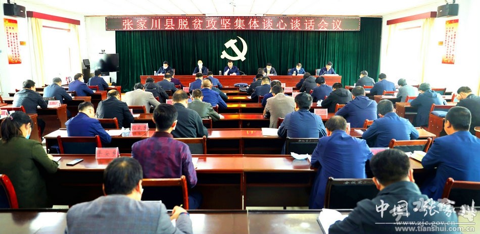 4月27日下午,张家川县委书记陈晰主持召开脱贫攻坚集体谈心谈话会议,深入学习领会习近平总书记在决战决胜脱贫攻坚座谈会和听取脱贫攻坚成效考核汇报时的重要讲话精神,传达学习中共中央政治局常委、全国政协主席汪洋在脱贫攻坚约谈会议上的讲话精神以及市委书记王锐在脱贫攻坚集体谈心谈话会议上的讲话精神、市委组织部关于转发省委组织部《关于印发<在决战决胜脱贫攻坚中更好地激励干部担当作为的具体措施>的通知》的通知等会议文件精神。