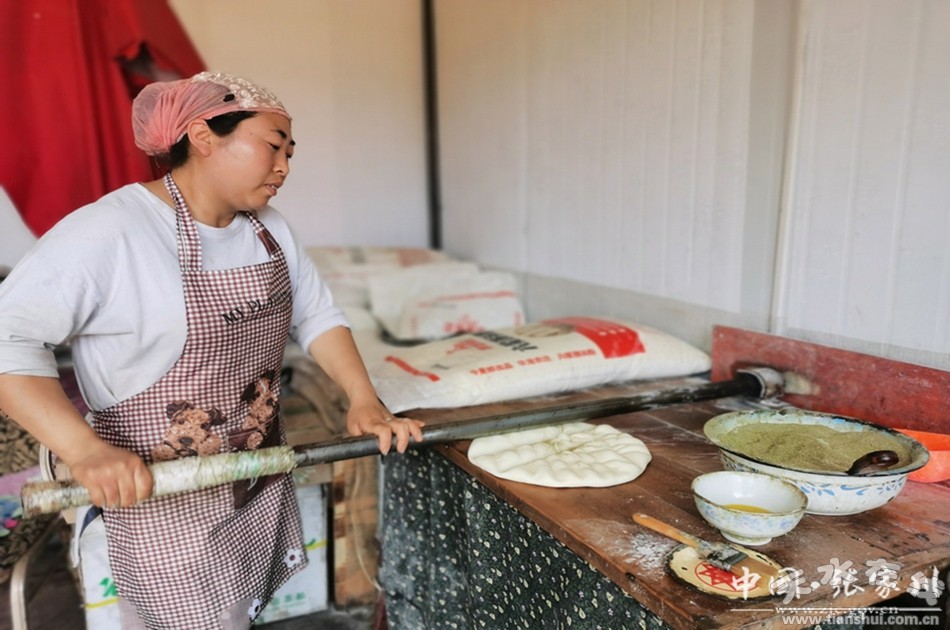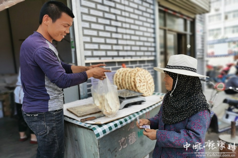 而在一处锅盔店铺里,一对年轻夫妻揉面,用一根铁棒在一个圆形的面团上不停辗压,然后在炭火上烤制,大约十分钟左右,一个圆圆的、味道脆酥的锅盔就出锅了。一位顾客迫不及待的通过微信支付,摊主给装上两个锅盔高兴地转身离开。当记者问一天能卖多少个锅盔,收入怎么样?聪明的摊主告诉记者,这是商业机密,一个锅盔共3斤卖15块,生意好着哩!