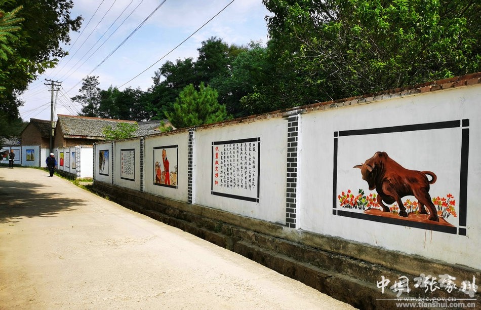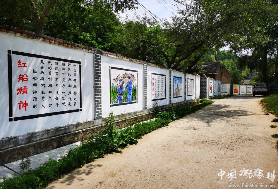 夏日的张家川草木葱茏、万物繁盛,沿着305省道古土梁岔道口走进恭门镇海河村,村民房前屋后一幅幅彩绘的党史画,在阳光和花朵的映衬下,显得格外耀眼、引人注目。