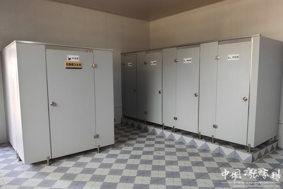 在龙山镇南门十字,记者看到一座新建成的公厕,已投入使用。公共卫生间外墙和内墙都贴上了瓷砖,设有环卫工人休息室和男、女厕所。公厕内部设施齐全,环境卫生干净、整洁。配置了水冲式蹲便器、感应式洗手池等设施用品。还设置了残疾人专用坐便器、无障碍坡道、安装了护栏扶手,切实解决了特殊人群如厕不方便的问题。