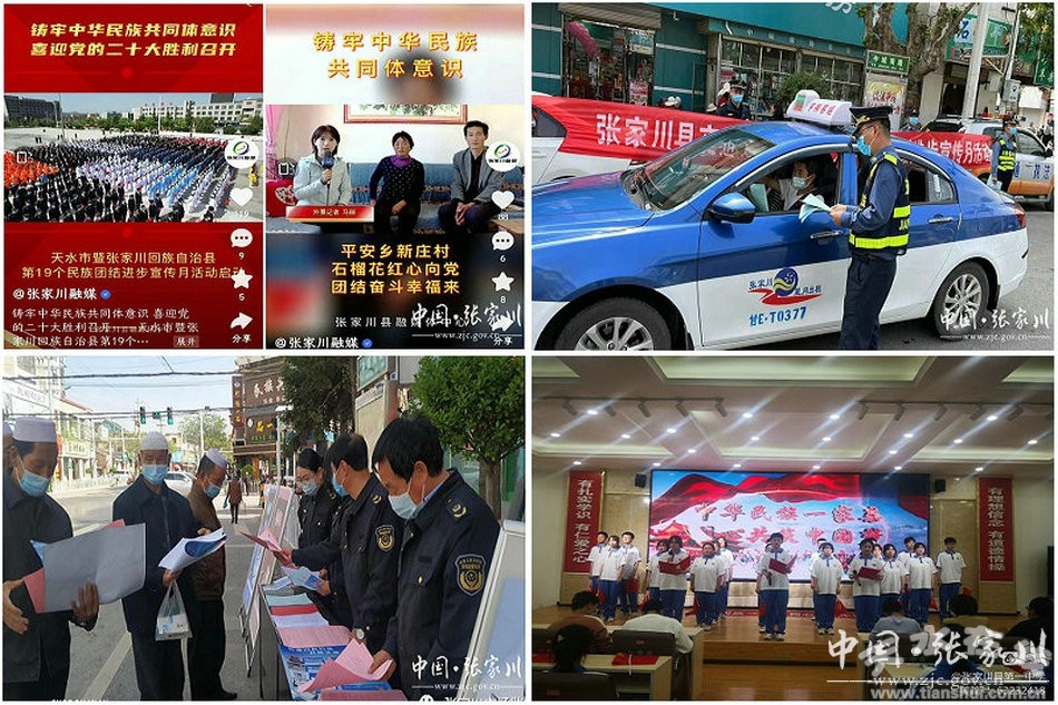 丰富活动载体,有形有感有效。一是宣传月活动启动仪式同步举行,有形式。5月10日,天水市暨张家川回族自治县第19个民族团结进步宣传月活动启动仪式在县行政广场隆重举行,市委统战部副部长、市民宗委党组书记、主任傅小春出席并讲话,县四大组织主要领导出席,来自全县各行各业1000余名干部群众参加。随后各乡镇和部分县直部门同步开展本单位宣传月活动启动仪式,全县第19个民族团结进步宣传月活动全面启动并有序开展。各乡镇各单位不断创新宣传教育载体和方式方法,开展各类主题突出、特色鲜明的活动。宣传月期间,全县举办9场次主题文艺演出,发放《铸牢中华民族共同体意识从我做起倡议书》5200余册。二是新闻媒体宣传报道全面深入,有感触。县融媒体中心开设“铸牢中华民族共同体意识”宣传专栏,专题报道各乡镇各单位宣传月活动开展情况34条。积极开展“家乡新变化·喜迎二十大”主题采访报道活动,记者同志深入基层专访撰稿,相继报道《张家川县恭门镇:产业发展谱出民族团结新篇章》,《平安乡新庄村:石榴花红心向党团结奋斗幸福来》,《张家川县胡川镇:描绘民族团结新画卷》等综述性新闻报道7篇,全方位、多角度宣传民族团结进步事迹。在“印象张家川”客户端推出“铸牢中华民族共同体意识”线上竞答活动,社会各界3500余人参与答题,助推形成全民动员、全民参与、全民共建共享的民族团结进步创建氛围。三是党的民族宗教理论政策集中宣讲,有实效。在省、市宣讲的基础上,县四大组织25位领导干部深入包抓的乡镇和社区,组织干部群众、宗教界人士等集中开展党的民族宗教理论政策宣讲活动。全县各级党组织书记在本系统本单位充分利用“三会一课”“主题党日”开展形式多样、贴合实际的宣讲,截至目前宣讲任务完成率达60%。通过宣讲活动的广泛开展,党的民族宗教理论政策深入基层一线,广大受众入脑入心,进一步推动民族团结进步宣传月活动走深走实。
