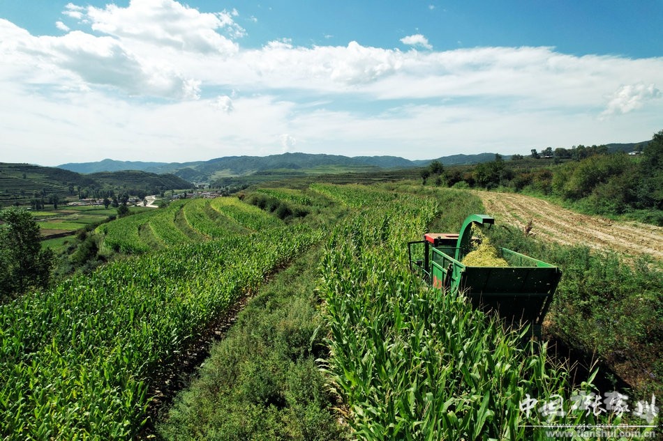 9月5日,在张家川县梁山镇岳山村的饲料玉米地里,机声隆隆,大型玉米青贮收获机在田间来回穿梭,一行行玉米齐刷刷倒下,粉碎后的秸秆被装进车厢,一次性完成玉米秸秆的收割、粉碎、装运等作业,并直接运往养殖场进行青贮。