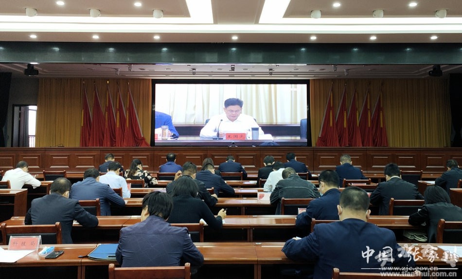 县领导张育明、刘二贵、铁宝禄、张彦林及县直部门负责人在张家川县分会场收听收看会议。
