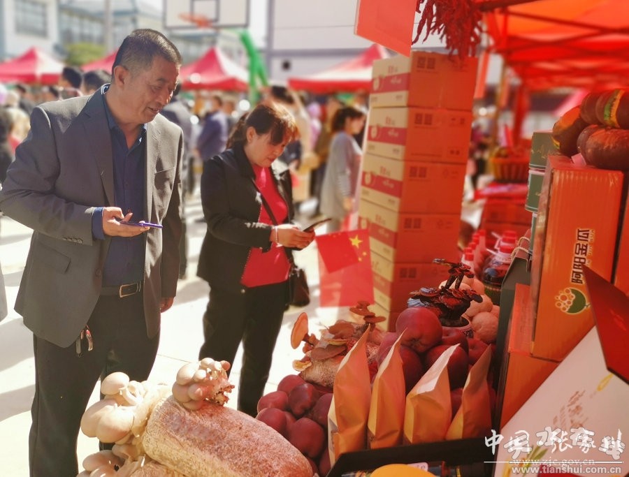 川王镇党委副书记、镇长李云带领川王镇干部现场为他们镇生产的农产品代言,我们川王镇聚富源合作社生产的五谷杂粮是绿色无公害产品,鸡蛋是土鸡蛋,老胡麻油的营养价值高,欢迎宾客朋友们助农购买。他们的助农推介吸引了客商购买,有位来自于天水的客商和聚富源合作社负责人马强洽谈起合作事宜。
