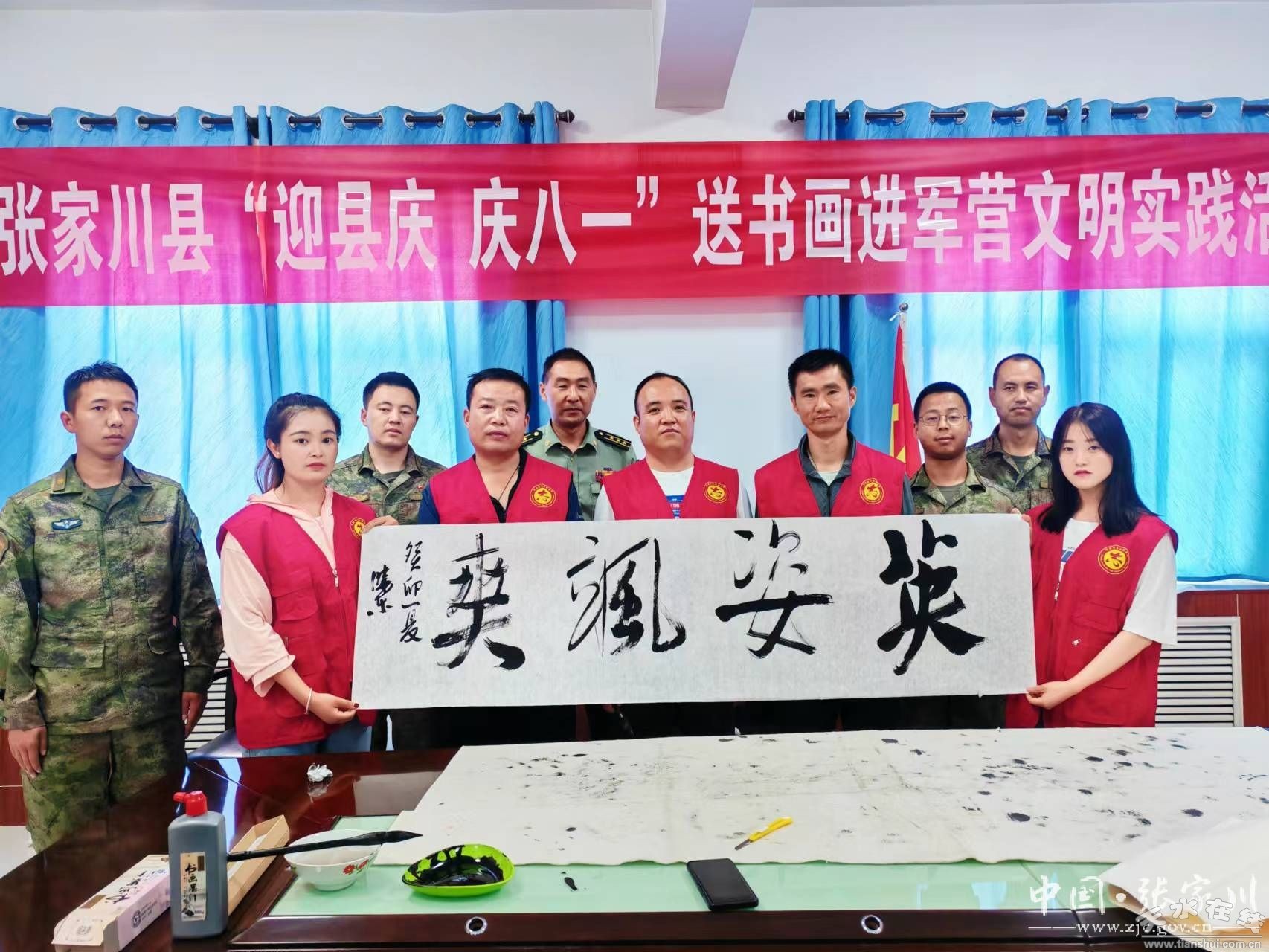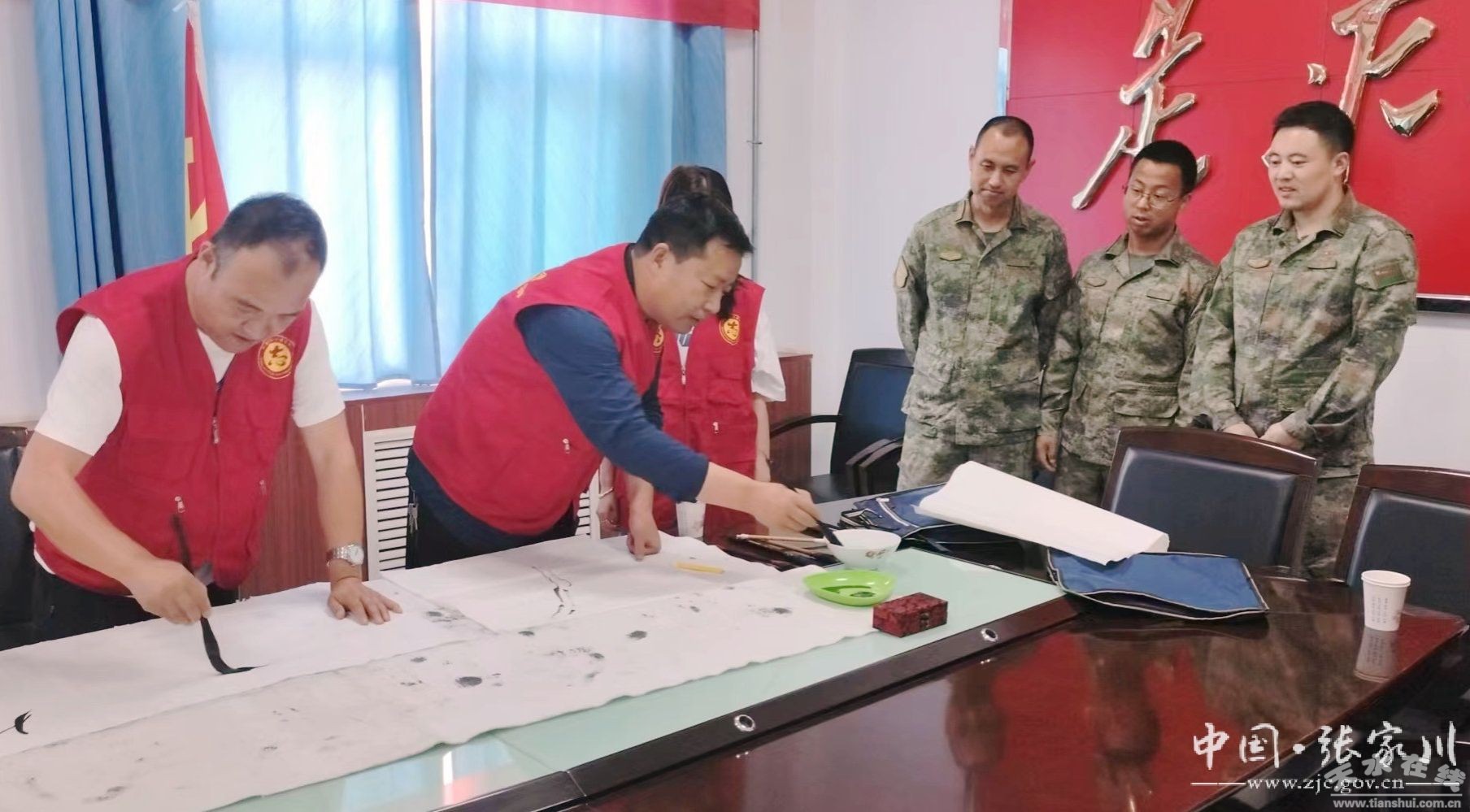 在八一建军节来临之际,7月28日,张家川县“迎县庆,庆八一”送书画进军营文明实践活动在张家川县人民武装部开展。县新时代文明实践中心办公室、县文化馆、县文艺志愿者参加。他们用一幅幅书画作品表达军爱民、民拥军的军民鱼水情。