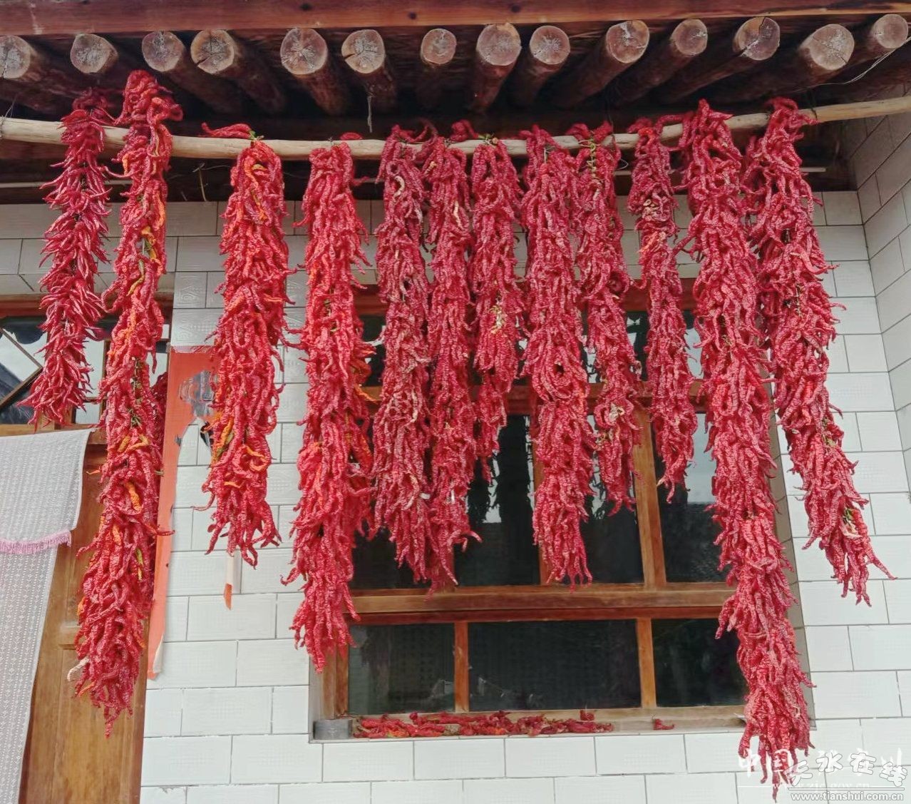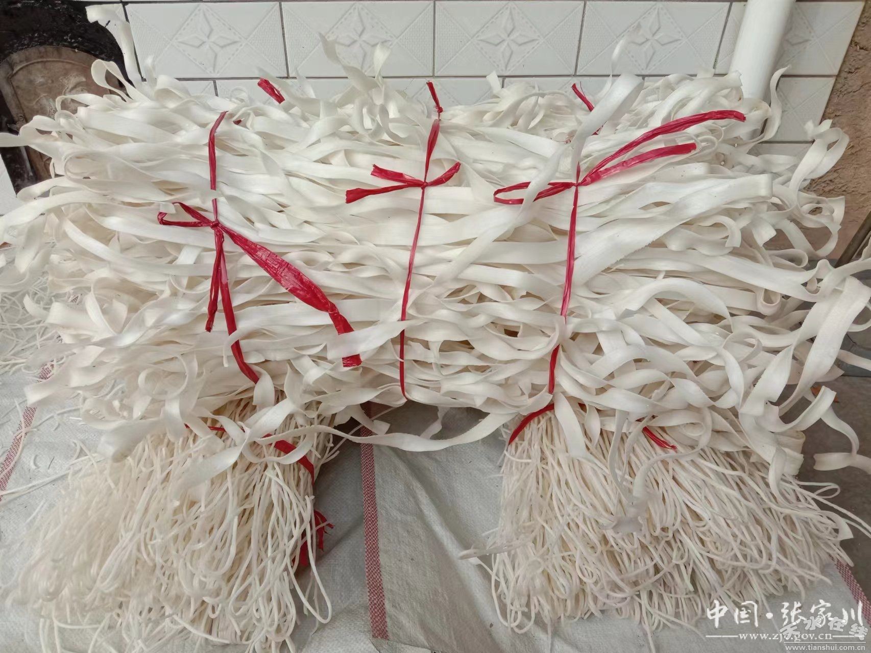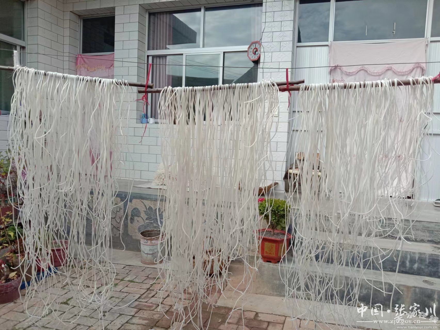洁白如雪,柔润嫩滑的纯土豆手工粉条大宽、韭叶、细条长长短短地挂在院子里撑起的木杆上,和不远处的红辣椒、玉米棒子交相辉映,一派五谷丰登的景象。