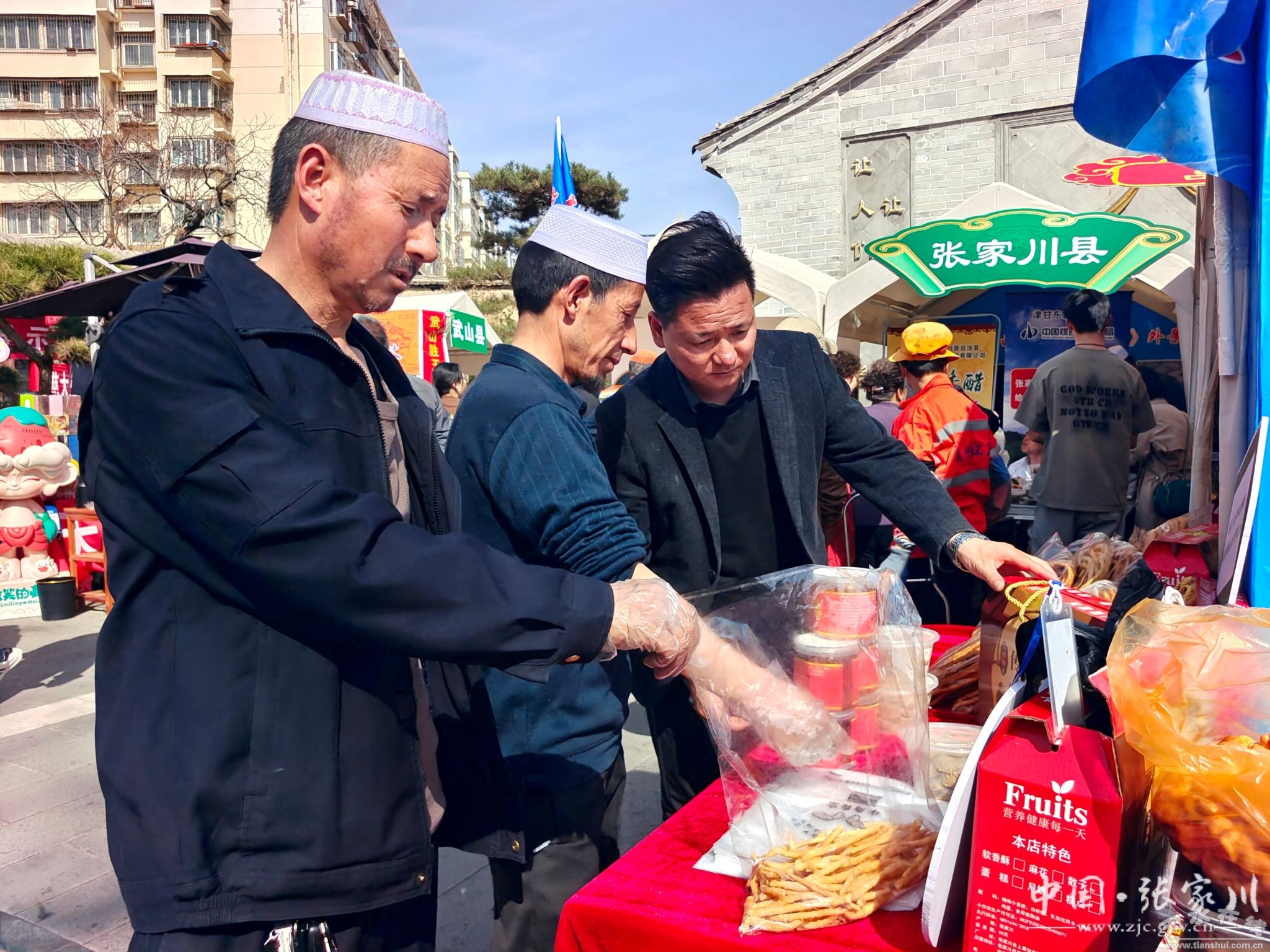活动现场设置了特色产品展销区,销售张家川文创产品、农特产品及特色小吃。各个展位上摆满了花椒、胡麻油、火麻油等具有张家川地方特色的农产品;十三花、麻辣烫、锅盔、馓子、油香、醋粉等张家川地方特色小吃;鑫阳麻辣烫料、海掌柜八宝茶、羊阿洋酸辣粉、蜂蜜等特色产品以及马家塬车舆模型、盖碗茶杯等精美绝伦的张家川特色文创产品。工作人员热情招待前来参观的游客,邀请大家免费品尝。各乡镇也纷纷发挥自身优势,通过发放宣传册与农产品,赠送景点门票等方式为自己引流量。