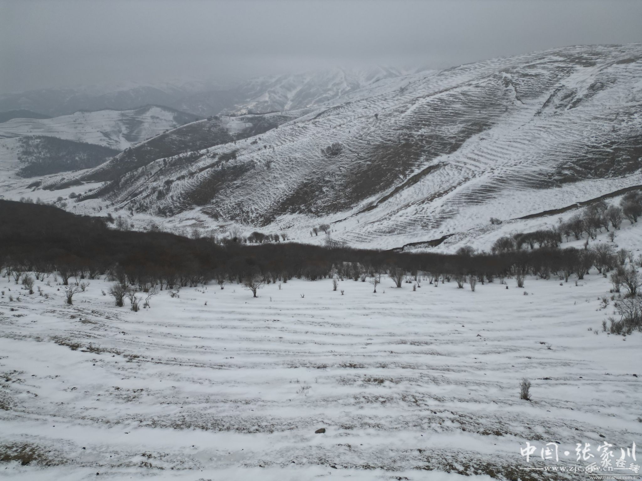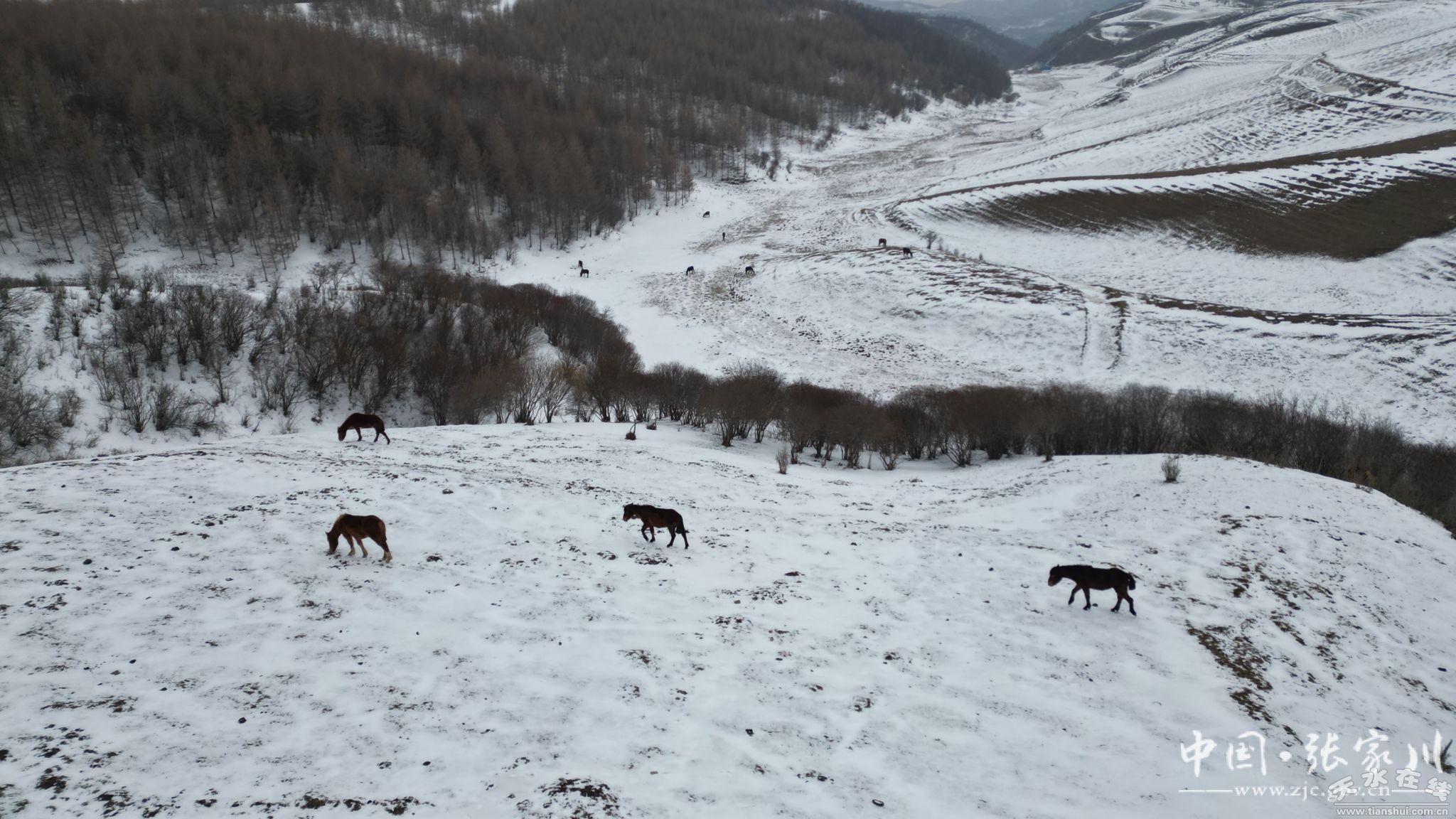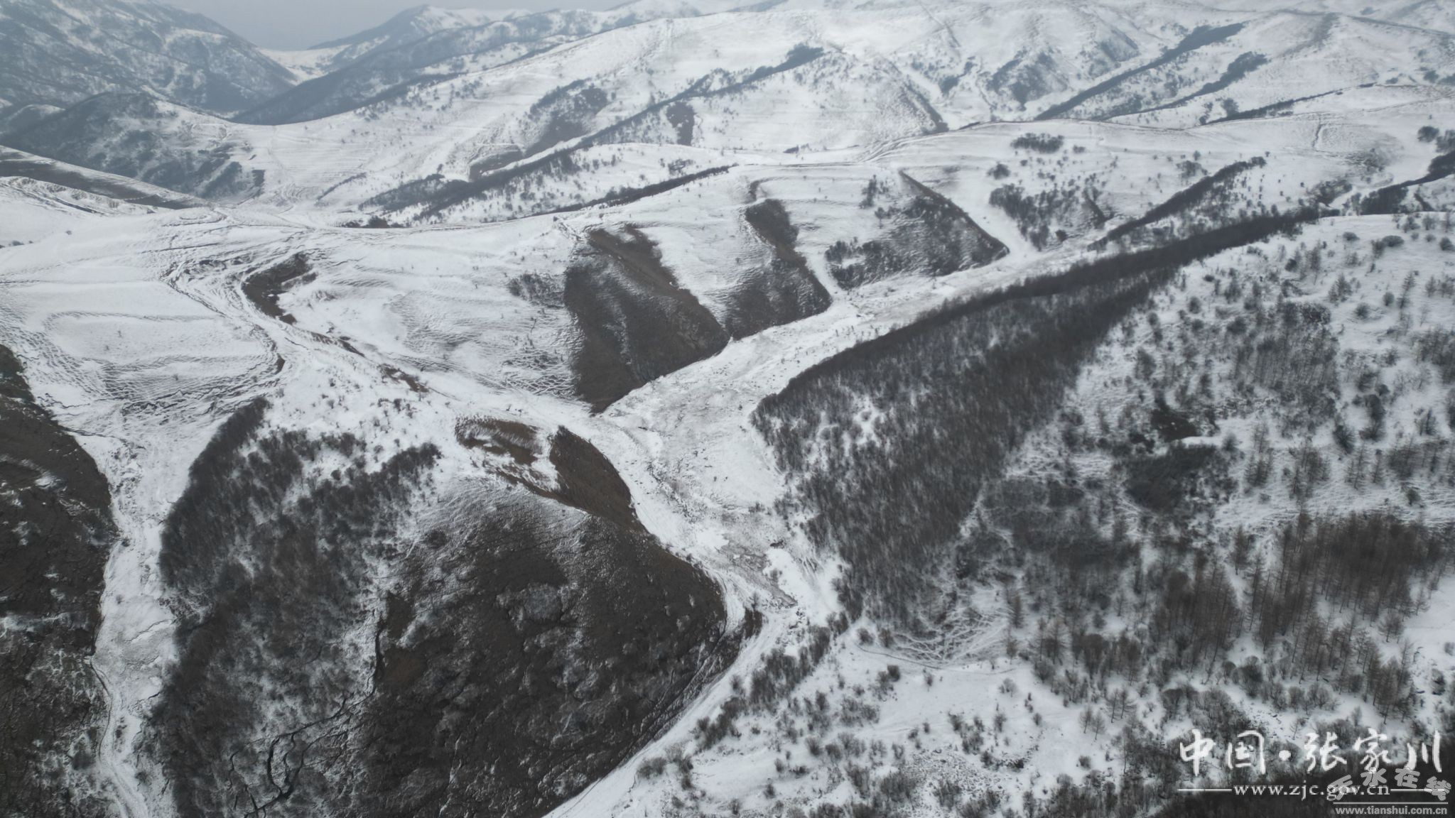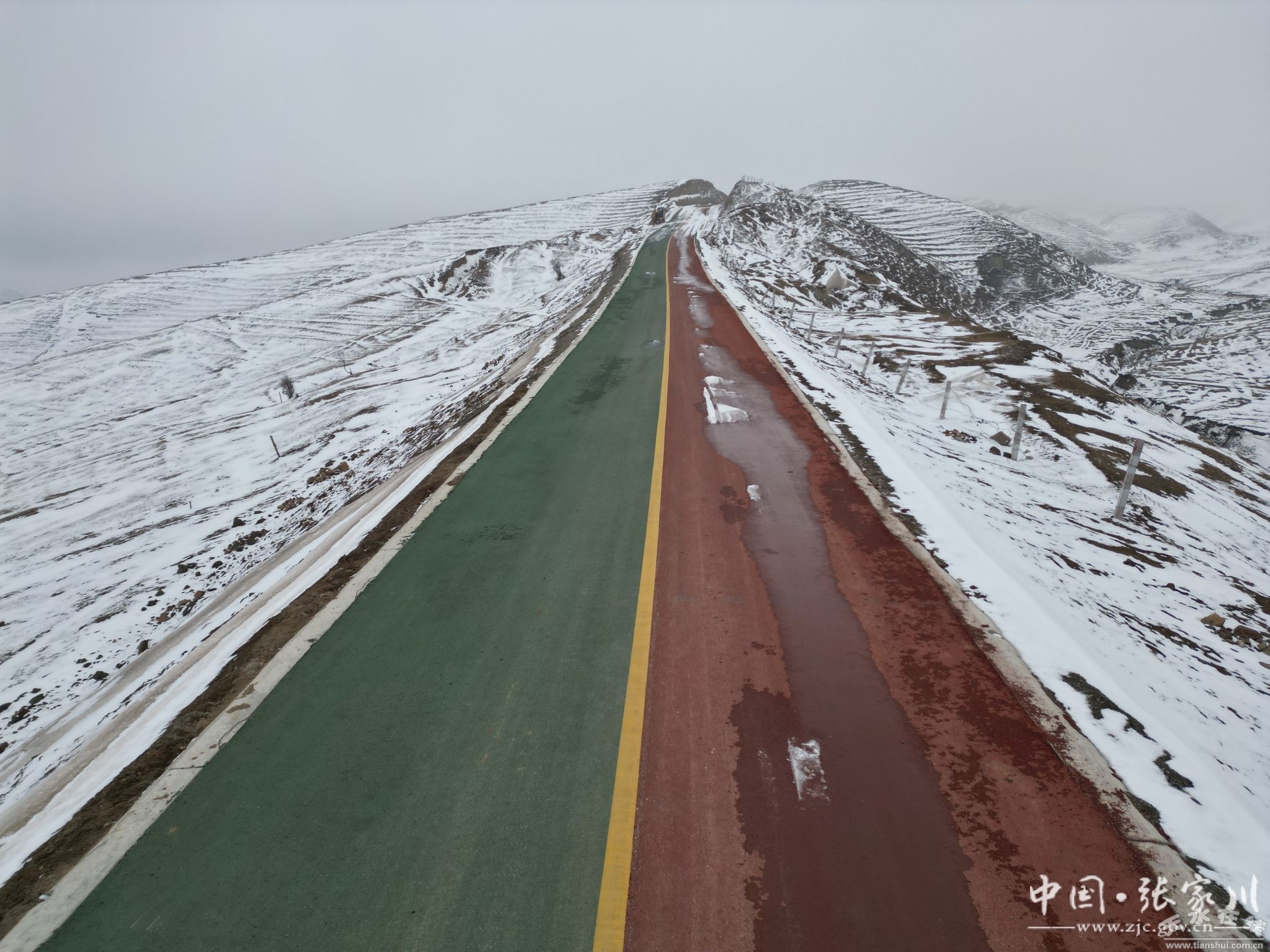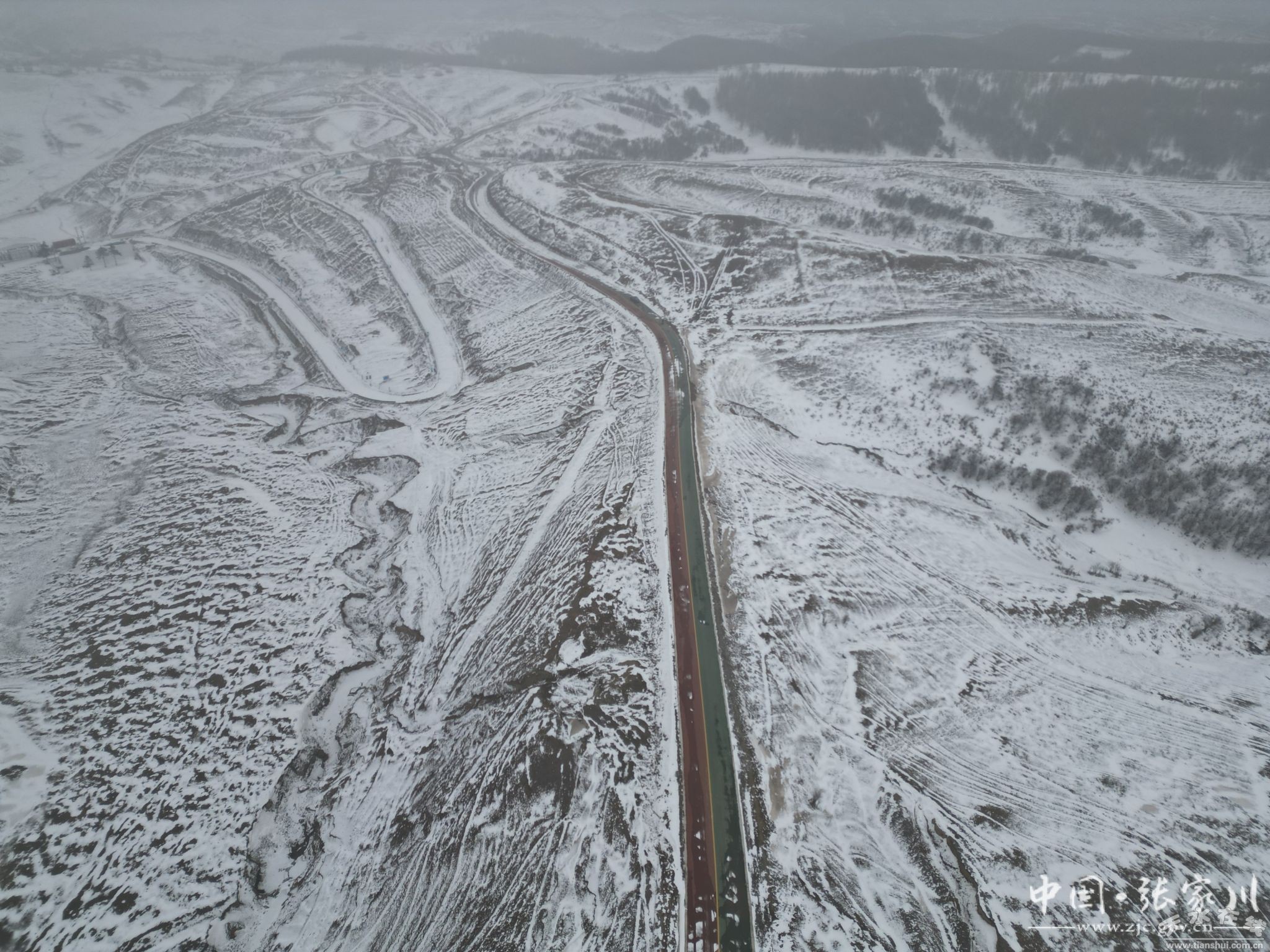 近日,一场春雪浸润张家川大地,记者在位于张家川县平安乡的白石咀牧场航拍,无人机镜头下白雪覆盖莽莽草原,山顶上的大型风电塔隐入云端,高大挺拔的松树像战士一样站立于茫茫林海,置身于林海雪原之中,呼吸一口清新的空气,顿觉心旷神怡。新修建的关陇古道风情线沿线彩虹大道如一条五彩的小龙一样盘旋于关山山间,异常美丽。