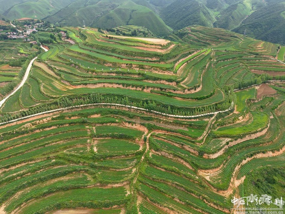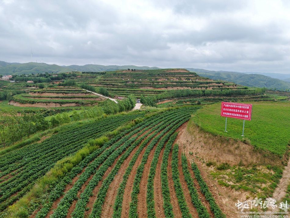 进入盛夏,气温升高、雨水增多,正是马铃薯生长的关键时期。近日,在张家川县刘堡镇东梁万亩马铃薯种植示范基地,连片的马铃薯田绿意盎然,膜上覆土技术覆盖的田垄整齐划一,农户们正忙着除草、监测墒情,田间一派繁忙而有序的景象。