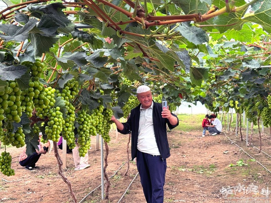 秋日的张家川大地,瓜果飘香。位于张家川县川王镇的阳光玫瑰葡萄产业园内盈枝满架,浓郁的果香沁人心脾,一串串晶莹剔透、如翡翠似玛瑙,一排排繁硕饱满、似瀑布倾泻而下。近日,产业园正式迎来开园采摘季,去年的回头客、慕名而来的游客、采购商络绎不绝,园内人头攒动,欢声笑语不断,共同分享这份丰收的喜悦。