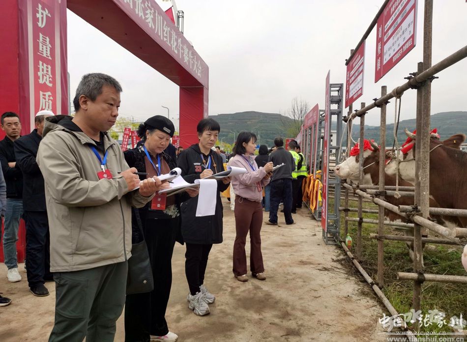 赛场上,来自全县各乡镇的数十头红花牛精神抖擞,毛色油亮如缎,体型健硕匀称,在主人的牵引下依次登场。裁判团队围绕体型匀称度、肌肉发育度、毛色光泽度等核心指标,进行专业细致的考评打分。“从参赛牛只的整体品质来看,张家川红花牛的品种优势和养殖水平都有了显著提升,选出的‘牛王’‘牛后’就是产业发展的‘活标杆’!”受邀担任点评嘉宾的甘肃农业大学教授华永丽给出了高度评价。