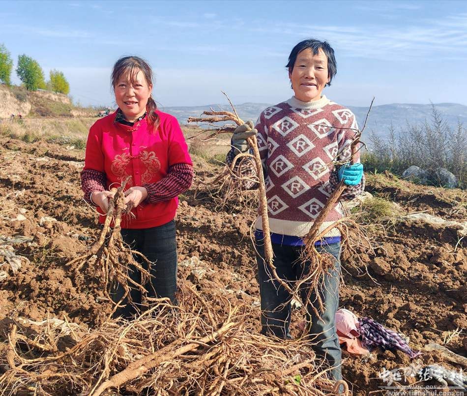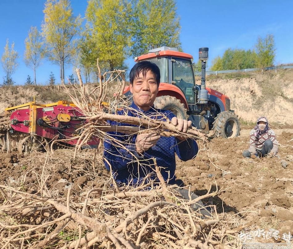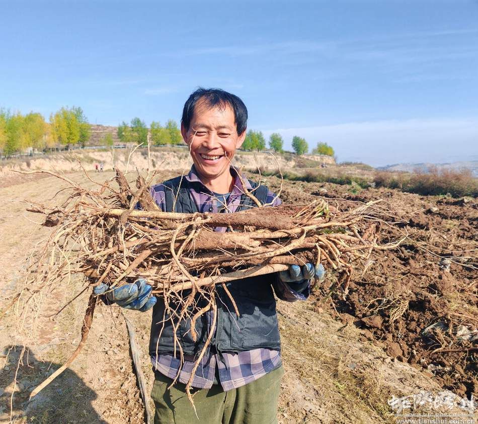 “你看,长得确实好得很!每一支都长到一斤重左右,今年真是大丰收!”初冬时节,阳光洒满张家川县大阳镇努家园合作社的药田里,负责人杨西苍捧着刚采挖的黄芪,表皮饱满、纹路清晰,脸上满是藏不住的喜悦。田埂上,采挖机器轰鸣作业,几十个附近村民弯腰捡拾、麻利分拣,沾满泥土的双手不停忙碌,田埂上的黄芪很快堆成小山,一派热火朝天的丰收景象。