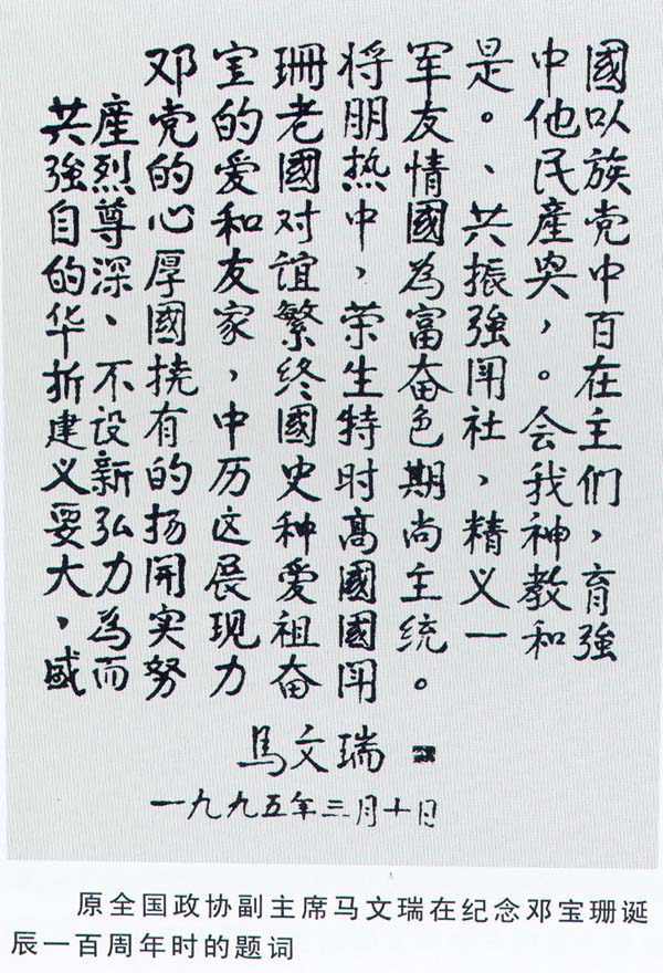 邓宝珊将军热爱祖国、拥护共产党、拥护社会主义制度。他曾说过:“我是甲午战争那一年出生的,可以说是生于忧患,也是饱经忧患,现在我能够亲眼看到新中国屹立于世界,这是我一生最大的欣慰和自豪。”所以,他时刻关心祖国的统一,始终怀念台湾的故旧,他多次给在台故旧写信及撰写对台广播稿,敦促故旧和台湾军政当局以民族大义为重,捐弃前嫌,共商国是,及早完成祖国统一大业。