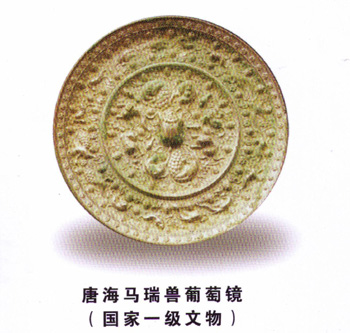 海马瑞兽葡萄纹铜镜,唐代,秦安县五营乡陈峡村出土,直径29厘米,厚2厘米,重4.5公斤。