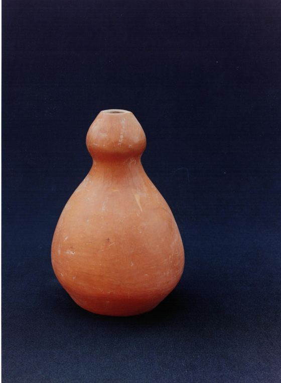 红陶葫芦瓶,半坡类型,口径2厘米,高15厘米。秦安县五营乡邵店村出土