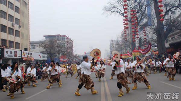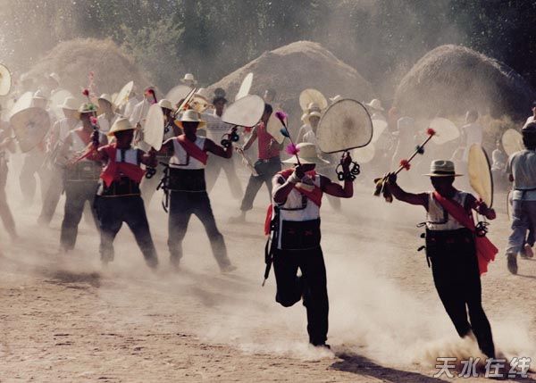 武山旋鼓叫扇鼓或鼙鼓,始于汉,兴于宋,盛于明。曹植《鼙舞歌》中有“乐人舞鼙鼓,百官雷林赞若惊”之句,扇鼓形似扇、又似芭蕉,边以铁铸成,面蒙去毛羊皮,手柄“硬三环套小九环”,成“九连环”。鼓槌用皮条编拧而成,并套缠花纹缨穗。打鼓时,鼓手头戴六瓣青白小帽,身穿赤膀围兜,外套羊皮马甲,腿穿灯笼裤,脚蹬麻线鞋,身背三色小旗,由几十甚至几百人的鼓队,围绕高五丈、顶有仙女骑鹤、中缠蟒蛇;吊有串串花团,围有八仙、二十四孝、福禄寿等花纸圈幡,鼓手左手举鼓,右手执鞭、边舞边打,鼓声铿锵、坠环“嚓嚓”。传说古时,武山森林茂密、狼群出没、恶兽成群,农历四五月份,狼群正出天花,乡民集结打鼓,鼓声震天撼地,震死狼仔、轰跑野兽,从而形成了武山旋鼓。