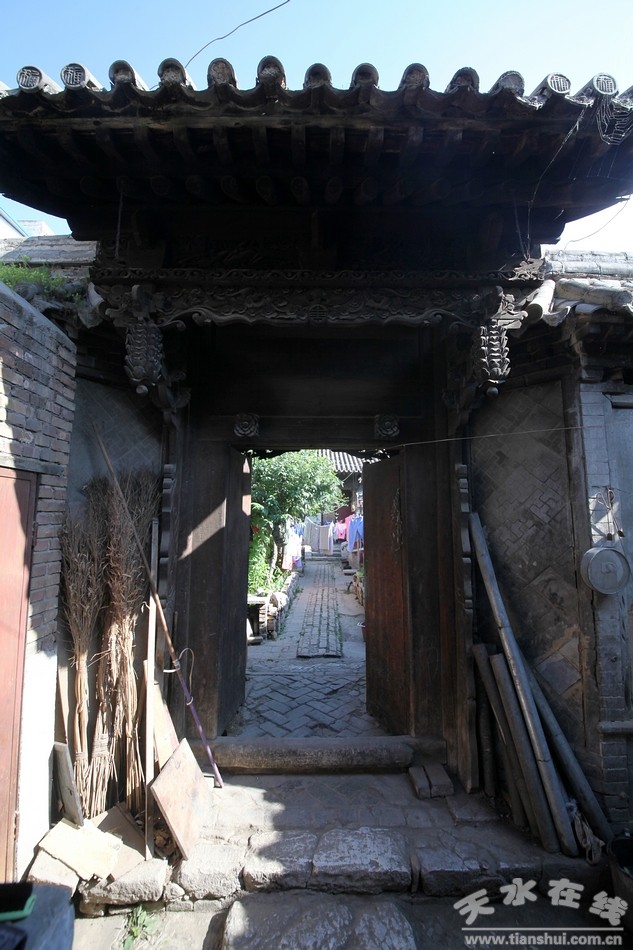 品着一块刚刚出炉、香酥糯软的烤花卷漫步在小巷里,走过一个个墙门,仿佛进入时间隧道,不经意间就会寻觅到另一片天地。巷子的最深处有几组古老的院落,这里就是清代煊赫一时的天水北门张氏的居所(张氏以张庆麟发迹,张庆麟为咸丰庚申科进士,曾任河北广平县令,归故里后,因“品行高洁、乐善好施、济危扶困”而名著乡里,秦州人尊称其门为北门张氏),2003年7月5日,甘肃省人民政府公布张庆麟故居为省级文物保护单位。走进澄源巷23号院(张庆麟宅院),迎门便是一面雕刻精美的“五福捧寿”图,为砖雕照壁,左转过垂花门到倒座廊道,由廊道进入外院,外院有5间倒座房,东西厢房各3间。走过外院,再过纵轴线中部虎座门,才可到达内院。内院正厅房3间,东西厢房各3间,内外院回廊四合,四面均为充满木质纹理的金柱墙面,极具亲和力,使院落形成宜人的三重空间。