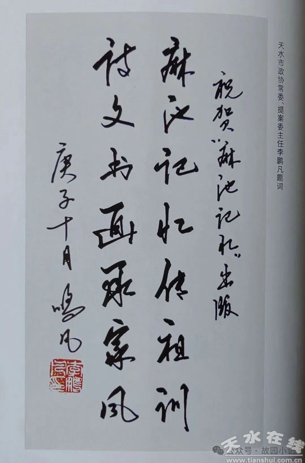 2020年11月,近三十万字之《麻池记忆》再付梓。此前春昌嘱吾题句,遂书“麻池记忆传祖训,诗文书画承家风”以赠,并收录刊印,心甚欣慰,亦倍感荣幸。麻池记忆,亲情滚滚,乡情浓浓,读之令人心生敬意!常翻阅,亲切有加。