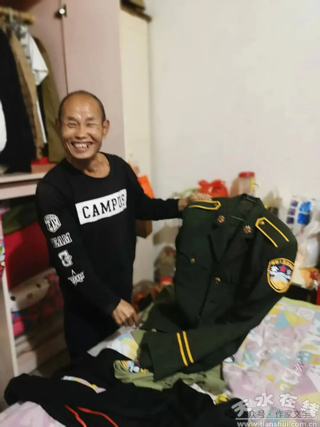 屋里静悄悄,电视闪着——一场足球赛正播着。他已上床靠着枕头,神色疲惫。见我来了忙示意坐床沿。我问怎么睡这样早,他指指自己的头。许是染了风寒。屋子收拾得倒还利落。他高兴起来,从床头筐子里摸出红得透亮的甜柿子塞到我手里。又翻身下床打开衣柜,郑重取出朋友送的公安服向我展示。穿上带肩章的外套,他挺直腰板,眼里闪光,像个得了新装的孩子。