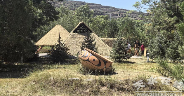 在距今6000年的大地湾二期复原房子,我发现房屋内门道为斜坡状,门道口有一条行坑灶,四周墙壁各有十几根向中心倾斜的立柱,与地面的四根立柱相连,构成四面坡式的屋顶,室内复制的生产工具,生活用具,均反映原始社会母系氏族的生活场景。嗯。在一处比较高大的房屋面前,工作人员讲,随着生产力水平的不断提升,先民们的居住条件、周边环境也不断改变。大地湾室内面积较大幅度增加,房入口大多有一台阶,部分房址建筑内不同程度出现厚达0.65米的红烧土堆积,地面大多采用草泥土铺制,个别房子则用防潮性能更好的料礓石抹铺设了一层防潮地表。大部分灶坑坑穴变深,改为圆形直桶状。有的房址在灶坑与门道之间增设了一个与灶坑相通的风洞,先民们居住的便捷、安全和舒适度整体增强,房屋建筑的雏形开始形成。