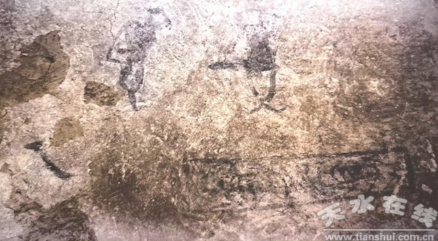 在一幅白灰面上绘制的神秘古朴的地画前,我驻足细看,这幅长约1.2米、宽约1.1米、使用淡黑颜料绘制,分上下两层,上层为三人像,中间人物持棍状,右侧人物具女性特点,左侧形象模糊,下方有并列的动物图像,被长方形框包围,动物形态结合昆虫触角与哺乳动物四肢。画面采用没骨法与线条勾勒结合的技法,人物比例协调,动物图案具有动态影像效果。地画的白灰地面由料礓石烧制,抗压强度接近现代100号水泥,颜料为草本植物炭化的纳米颗粒混动物胶,技术复杂。专家们推测画面可能狩猎教学图或驱疫仪式场景,也可能是图腾崇拜,史前宗教等场景。这幅保存基本完好的地画是我国目前发现的时代最早的独为立完整绘画作品,且画面动态捕捉手法比敦煌壁画还早近4000年,比此前最早单独作为绘画保存至今的长沙马王堆楚国帛画早好2000多年,专家讲,这幅地画的出现,改写了中国美术史。