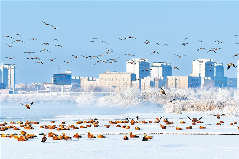 1月17日,张掖黑河湿地国家级自然保护区高台段的河道内,赤麻鸭在此悠然越冬,在两岸雾凇的映衬下分外耀眼。 新甘肃·甘肃日报通讯员 郑耀德
